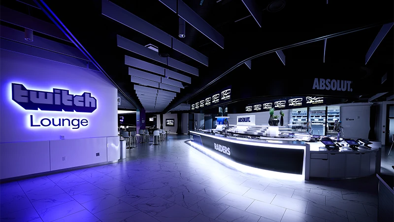 Twitch Lounge offers a dynamic setting with soft seating lounges, specialty bars, and 72 screens for custom branding—perfect for receptions or breakout use with other stadium spaces.